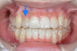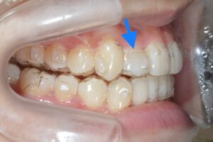 青い矢印の部分、アライナーと歯に隙間ができています。