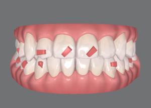 右上2番目の歯を前に出す動きや、下の歯を全体的に寄せる動き、分かりづらいですが上の前歯の傾きを直す動きもしっかり組み込まれています。