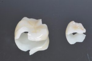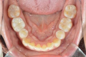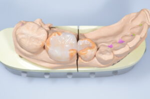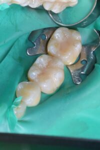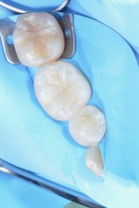 | 治療内容 | 銀歯を白くしたいという希望に対して、e.maxによるセラミック治療と、CR充填を行なった。 1回目に左下の小さな銀歯を除去してCR充填、2回目に右下の大きめの銀歯を除去して仮詰めを実施。3回目に型取りを行い、4回目にセラミックインレー(e.max)を装着した。 |