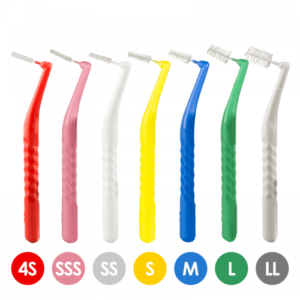 歯間ブラシは細いものから太いものまで細かくサイズが分かれています。当院では7サイズそろえております。形状はL字型とストレート型があります。