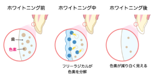 エナメル質はフリーラジカルによる着色有機物の分解とマスキング効果で白くなる。