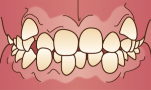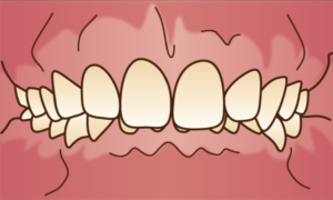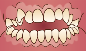 叢生(そうせい)とはそれぞれの歯が凸凹になっている状態です。歯が並べる場所に対して、それぞれの歯が大きいことが叢生が起きる理由で、大きな歯同士が押しくら饅頭をして、凸凹な状態でなんとか口の中に収まっている状態です。つまり、スペース不足が叢生の原因です。叢生は単独でも出現しますし、その他の不正咬合と絡んでいることも多いので、何が原因でスペース不足が生じているのかの考察は非常に重要です。