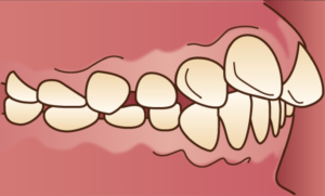 過蓋咬合(かがいこうごう)は前述しましたが、上の前歯で下の前歯が隠れてしまうような噛み合わせが深い状態です。重症な場合は下の前歯が上の歯の裏の歯茎に当たってしまっている方もいらっしゃいます。過蓋咬合の原因は上顎前突、噛む力が強くて交換期に奥歯十分出られなかった、奥歯の喪失や過度の磨耗、遺伝的要因などがあります。