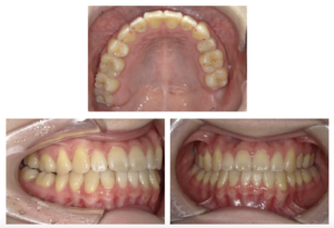 | 治療内容 | インビザラインで矯正治療を行った。上の第二小臼歯は内側に入り込んでいたので、抜歯が必要であった。下顎に隣接面削合(IPR)を行い、下の前歯を内側に引き込むとともに、内側に傾斜している上の前歯を外側(唇側)に傾斜させた。難しいケースだが、患者さんの協力により、順調に経過した。 |