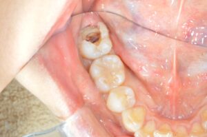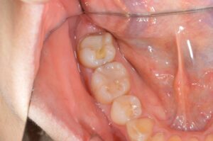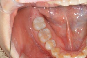 | 治療内容 | 右下大臼歯が欠けており、その下に虫歯があり、アンレーによる修復が必要となった。材料は金属かセラミックかを選択できるが、各種材料のメリット・デメリットを検討した結果、虫歯の再発をなるべく抑えるために、セラミックによる治療を選択された。 1回目に虫歯の除去、仮詰めを実施。2回目にデジタル印象(型取り)を行い、3回目にセラミックインレーを装着した。 |