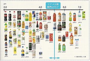 しかし、糖分を含むものを1日に何度もダラダラ食べたり飲んでいると酸性になっている時間が長く、虫歯になりやすくなります。pHは値が高くなれば中性に近づき、低くなるほど酸性に近づき、pH5.5以下になると歯の表面のエナメル質が溶け始めてこれが繰り返されることにより、虫歯が発生します。