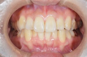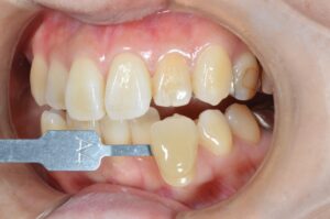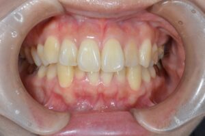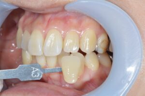 治療内容 左上の前歯が変色していた。変色の理由は過去の根管治療(神経の治療)によるものである。根管治療がなされた歯は徐々に色素の沈着により変色することがあり、このような状態を呈する。歯の内部に専用の漂白剤を入れて封鎖することで、色素を分解し歯を本来の色に戻す治療法があり、ウォーキングブリーチ法という。今回は適応であったため、ウォーキングブリーチ法を実施した。