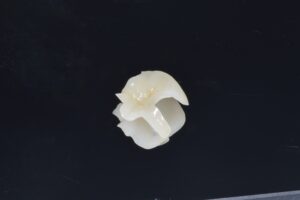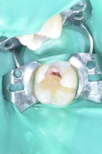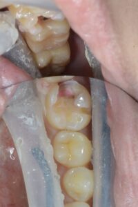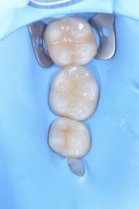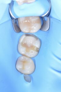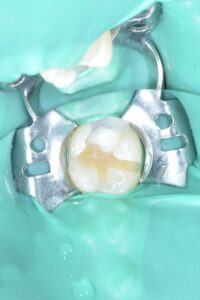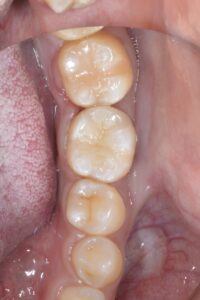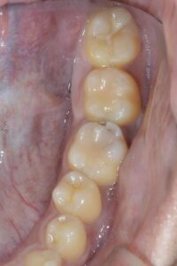 治療内容 左下大臼歯が欠けており、詰め物の下に虫歯を認めた。詰め物を外し外して虫歯を除去して、再度詰め物で治療する方針となった。虫歯は深く、神経に到達していたため、神経温存療法を行い、2ヶ月以上の経過観察を行なった。神経の生存が確認できたため、セラミックによる修復治療を行なった。材料は金属やセラミックを選択できるが、各種材料のメリット・デメリットを検討した結果、虫歯の再発をなるべく抑えるために、セラミックによる治療を選択された。