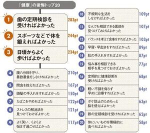プレジデントという雑誌に掲載されている2012年に行われた【「リタイア前にやるべきだった…」後悔トップ20】というアンケートではこんな結果が出たそうです!