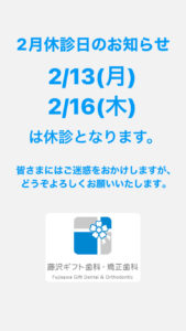 日曜・祝日・木曜(PM)・2/13(月)・2/16(木)は休診となります。