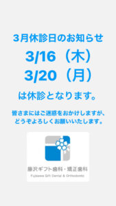 日曜・祝日・木曜(PM)・3/16(木)・3/20(月)は休診となります。