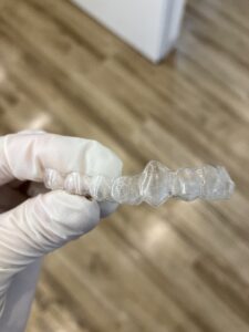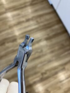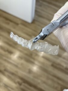 製造されたアライナーには顎間ゴムをかけるための切れ込みがないので、専用の道具を使って切れ込みを作ります!