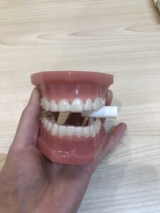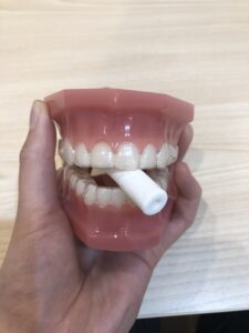 弾力のあるゴムのようなものを、左右の奥歯と前歯それぞれで噛むことによって、手で装着したアライナーをよりピッタリとフィットさせる大切な工程です!