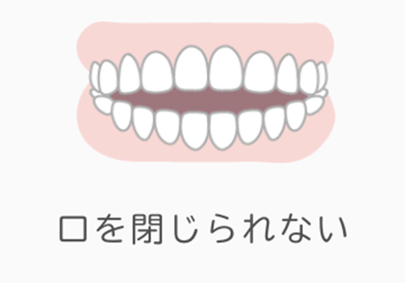 開咬は骨格性のものと、歯の並び方の異常で生じるパターンに分かれます。歯の並び方が異常になる原因として、口呼吸と前歯を舌で押す癖(舌突出癖)があります。