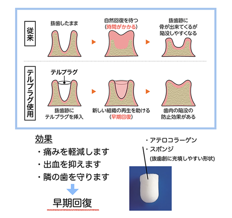 テルプラグはスポンジ状になったコラーゲンの塊で、抜歯した部位に入れる薬です。抜歯した部位を保護する作用と、治癒の促進作用などがあるので、抜歯後の痛みが軽減します。全ての抜歯に必要ではありませんが、特に下の親知らずを抜いた後は、お勧めできる薬です。